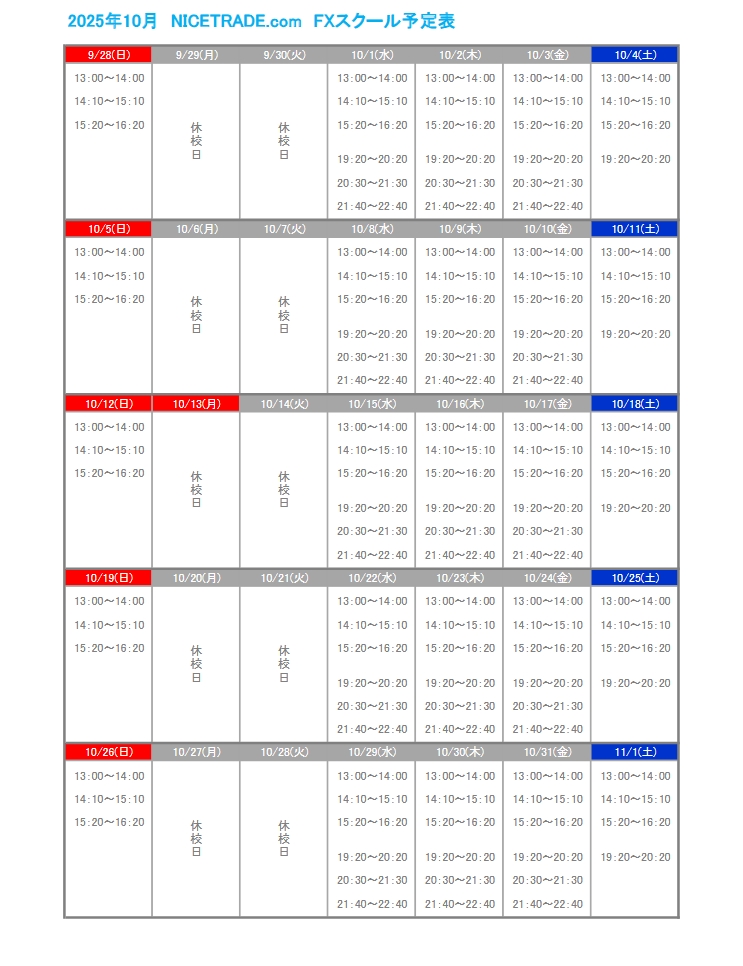 19 2020年11月の授業予定表をUPしました。 2020年11月の授業予定表をUPしました。 公開済み: 2020年10月19日更新: 2020年10月19日作成者: nicetradeカテゴリー: お知らせ