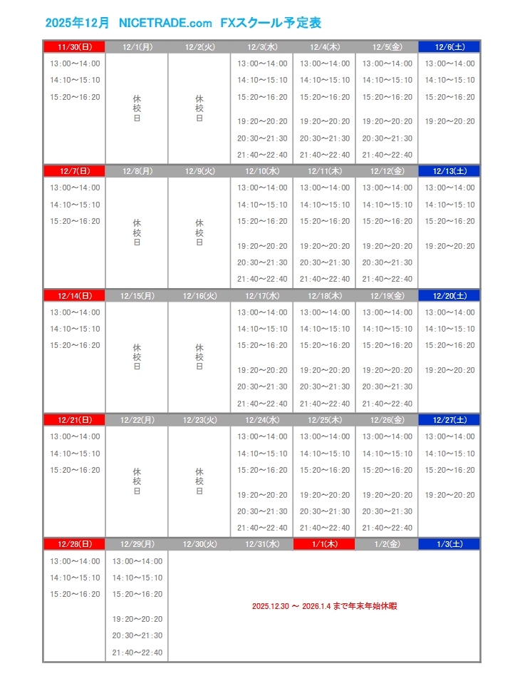 16 2023年12月の授業予定表をUPしました。 2023年12月の授業予定表をUPしました。 公開済み: 2023年11月16日更新: 2023年11月16日作成者: nicetradeカテゴリー: お知らせ