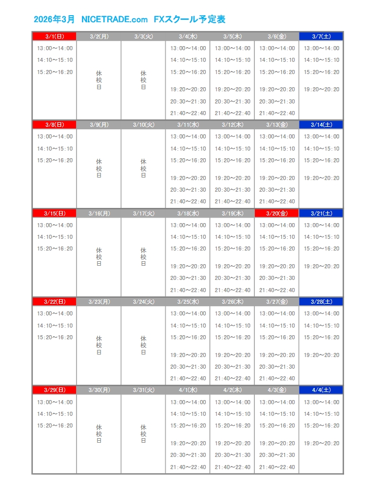 2026年3月の授業予定表をUPしました。 公開済み: 2026年2月12日更新: 2026年2月12日作成者: nicetradeカテゴリー: お知らせ 2026年3月の授業予定表をUPしました。 関連記事 25 FXスクール 11月度の授業予定表はこちらから 11月の授業予定表をUPしました。 授業予定表はコチラから ご予約はお電話にて承ります。 06-6121-2230 何卒宜しくお願い致します。 公開済み: 2016年10月25日更新: 2018年1月11日作成者: nicetradeカテゴリー: お知らせ 20 2019年4月の授業予定表をUPしました。 2019年4月の授業予定表をUPしました。 公開済み: 2019年3月20日更新: 2019年4月20日作成者: nicetradeカテゴリー: お知らせ 20 2019年8月の授業予定表をUPしました。 2019年8月の授業予定表をUPしました。 公開済み: 2019年7月20日更新: 2019年10月20日作成者: nicetradeカテゴリー: お知らせ この投稿へのトラックバック トラックバックはありません。 トラックバック URL